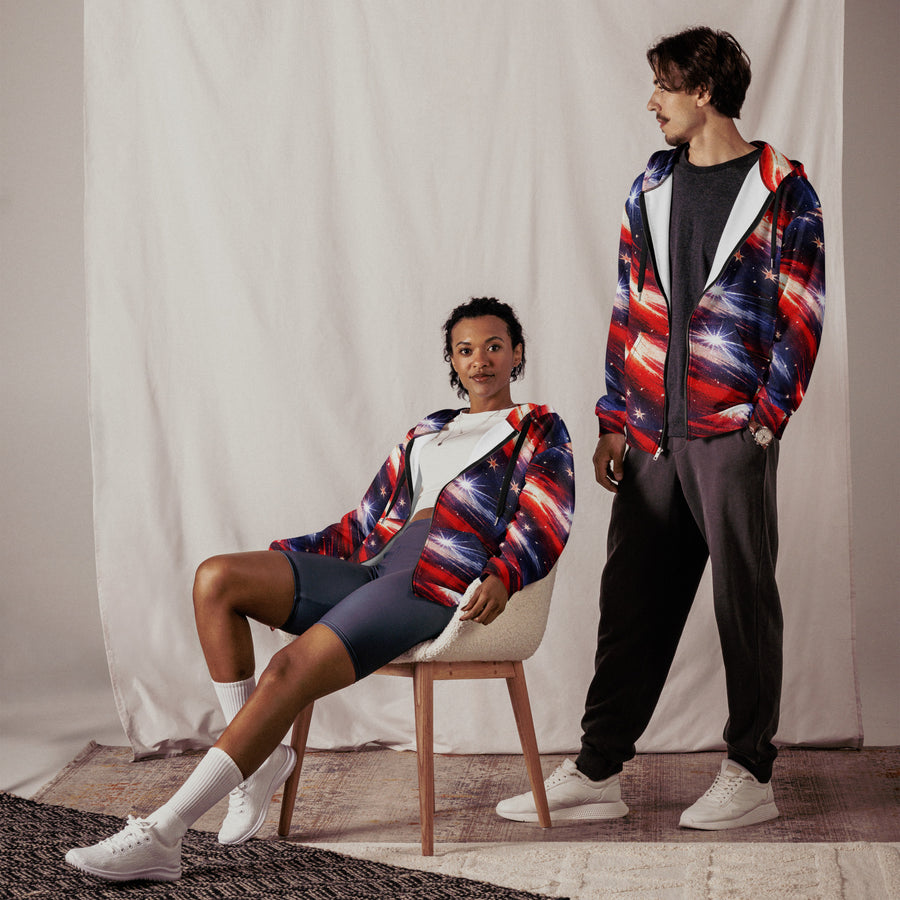 Make a bold statement with this Americana Zip Hoodie, featuring a striking red, white, and blue galaxy stars and stripes design.