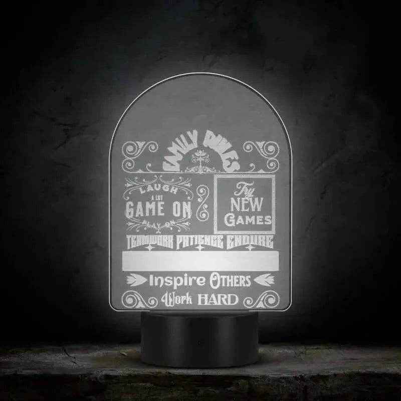 Use the Gamer Family Rules LED Lamp to Set the perfect ambiance for every session with this unique, laser-etched acrylic light.