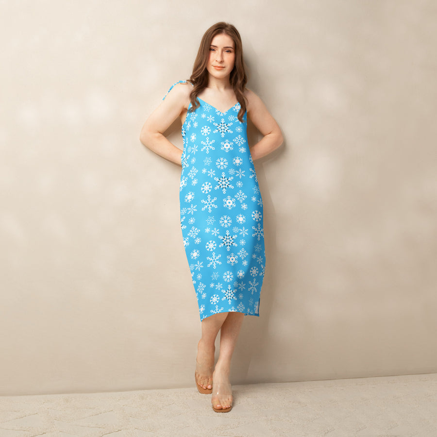 The adjustable tie straps and built-in bra create an easy, no-fuss fit—perfect for parties, date nights, or relaxed afternoons. Key Features 100% heavy polyester chiffon (5.9 oz./yd²) Midi length with flattering front slit Adjustable tie-close shoulder straps Built-in bra for comfort and support Soft light blue snowflake design Why You’ll Love It This light blue slip dress is breezy yet bold.